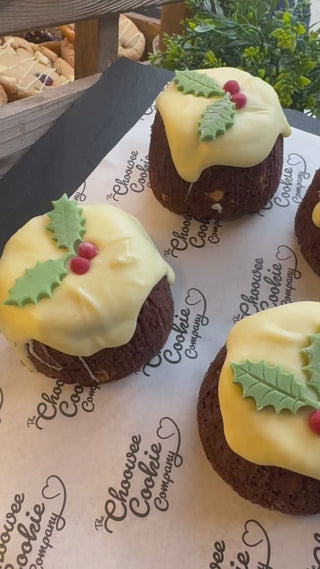 White chocolate chunks in a decadent and rich chocolate cookie dough, with a caramel centre. Drizzled with white chocolate and topped with our own handmade fondant holly leaves.